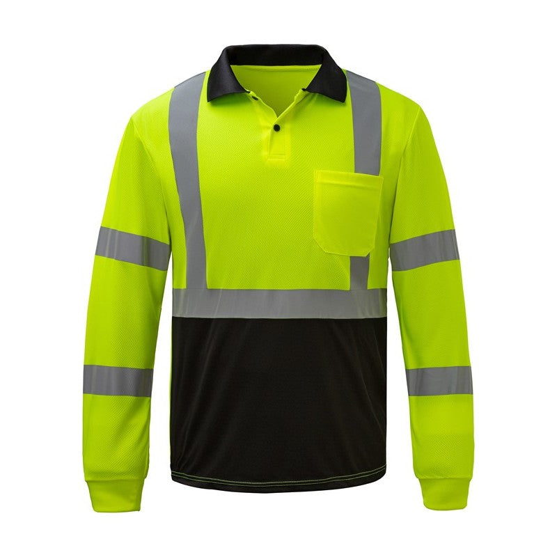 The GSS Class 3 Long Sleeve Polo Shirt (5507 Series) is designed for professionals who require high visibility, comfortable full arm coverage, and sun protection in their work environment. Crafted from Birdseye breathable and moisture-wicking polyester mesh, this polo shirt helps keep you cool and dry. It offers added SPF 50 sun protection and features 2" silver heat transfer reflective tape for superior visibility, along with a convenient left chest pocket.