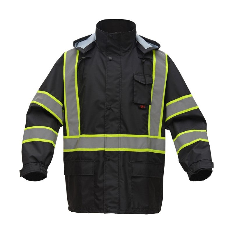 The GSS Class 3 Premium Two Tone Hooded Rain Coat (6005/6007 Series) with Black Bottom is engineered for superior waterproof protection and high visibility in adverse weather conditions. Constructed from 150D Oxford material with a PU coating, this jacket is fully waterproof with all seams sealed and features a comfortable mesh lining. It includes 2-inch high performance silver reflective tape with contrasting trim for increased visibility, along with multiple pockets including a phone pocket in the chest and two lower front pockets with flaps. This rain coat offers comprehensive utility and safety for professionals working in challenging outdoor environments.